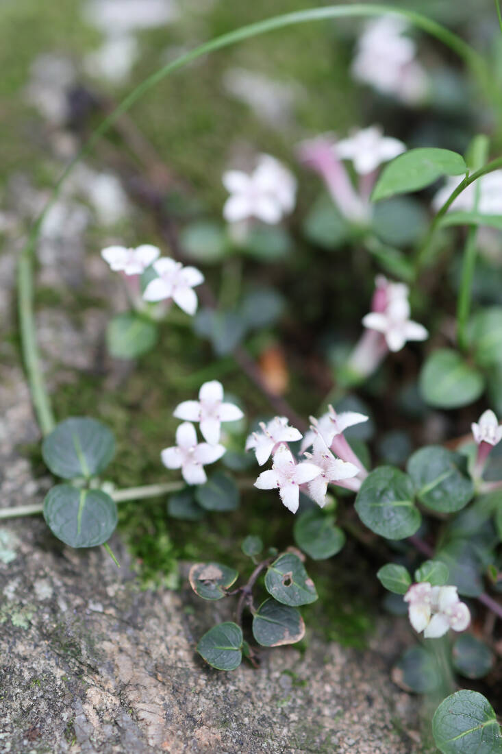 Partridgeberry grows no taller than a couple of inches. Its starry summer flowers are seen to best advantage when it is planted beside paths, near a retaining wall, or where it can sprawl over rocks in a shady garden. Its brilliant red fruits appear in early fall. Partridgeberry is hardy from zones 3 to 8 and requires acidic soil to thrive.