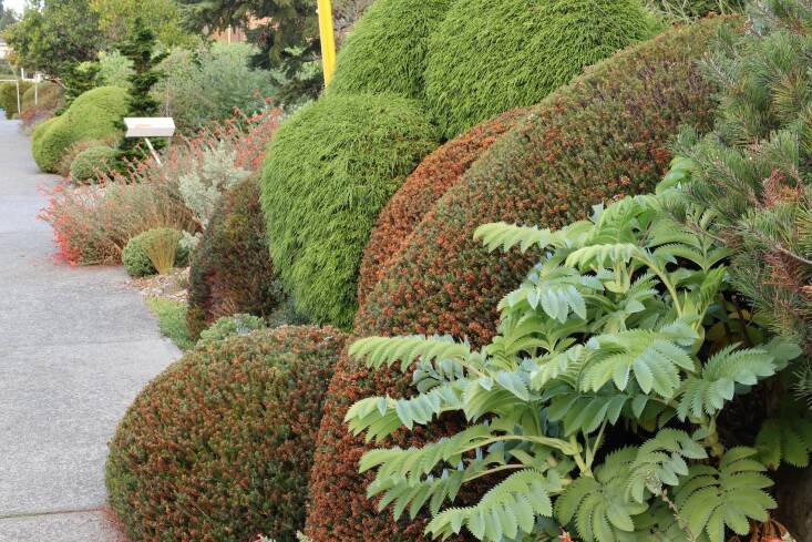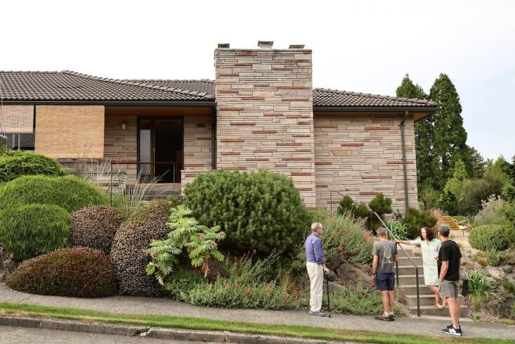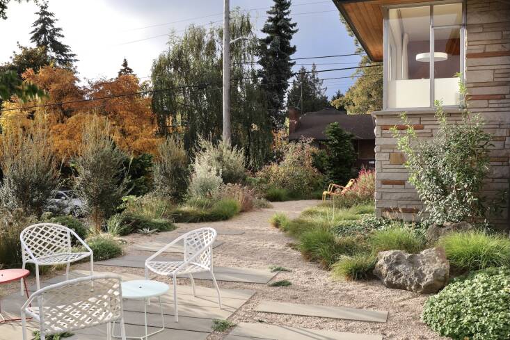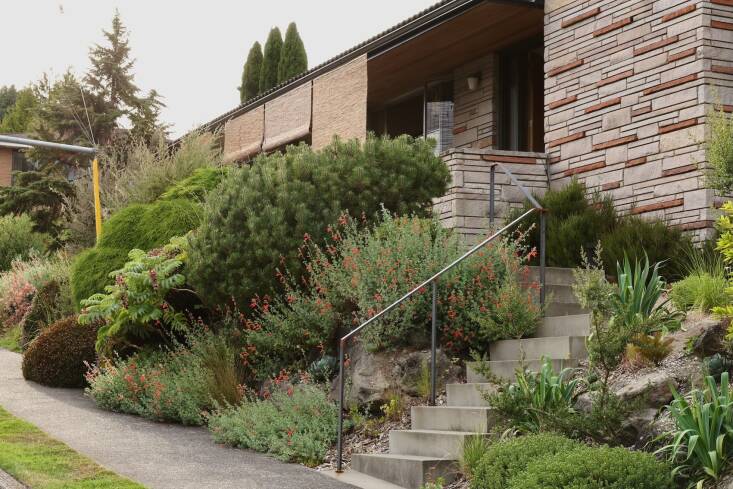 When Jane Orvis and Steve Hanson bought their 1950s house in Seward Park, Seattle, they kept the original pink-tiled bathroom. But what about the mid-century shrubbery, arranged around a lawn—did that have to stay? Most people would reply, “absolutely not,” but Jane, who is a keen gardener, wanted to take a more closed-loop approach and consulted with the landscape architect Jonathan Hallet, of Supernature. On a joint visit to the Seattle Arboretum, a trio of plants in the New Zealand garden caught their attention: a topiarist’s hebe, red tussock grass, and a shrub similar to manzanita. They had all the “lightness and air and movement” that Jane’s garden was in need of.