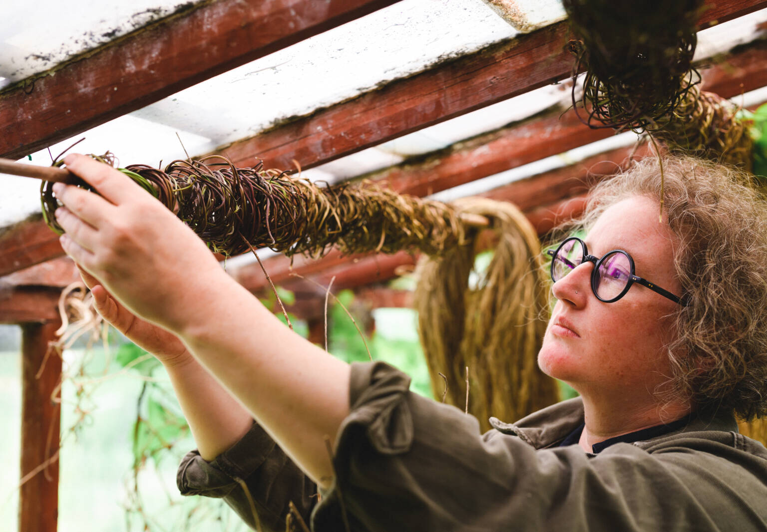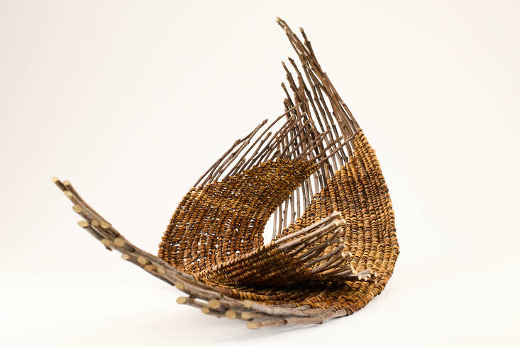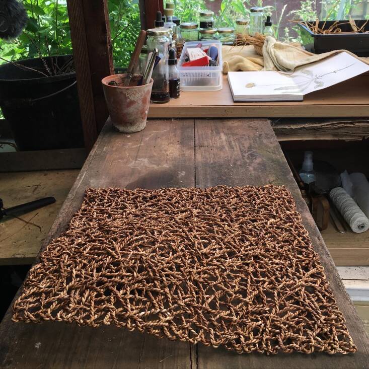 Peek through the window of the main shed and your eyes will be drawn to a wonderful organized jumble of plant pots, trays, tools, jars of homemade botanical inks, sketches, scribbles, samples, fragments of ceramics, wire, plastic, and other unearthed objects, as well as an ever-changing assortment of plant fibers in various stages of drying and hand-processing. This is where Fox’s uniquely beautiful and thought-provoking textile art begins to take form.