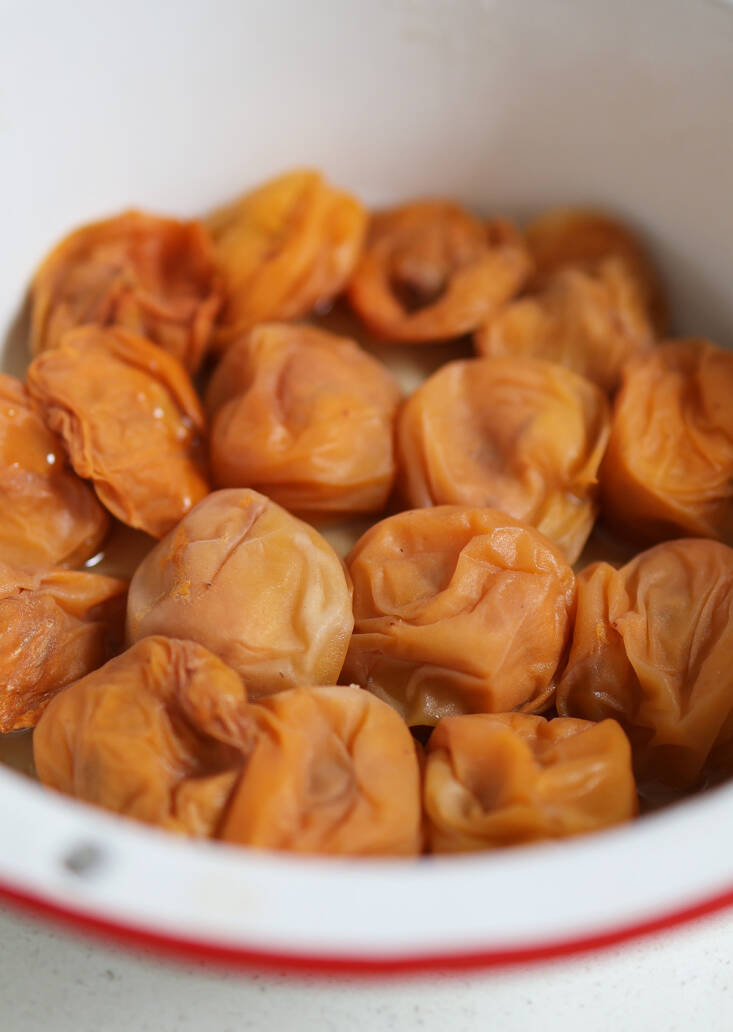 Umeboshi are traditional fermented Japanese pickles made from under-ripe ume—the fruit of Prunus mume, a Japanese apricot. Fermented in a syrupy brine, the firm, raw ume are transformed into soft and mouthwateringly tangy pickles with a reputation as a probiotic hangover cure and source of antioxidants. While they are commercially available, homemade umeboshi are next-level in terms of flavor and texture. (For label readers, they also contain no artificial coloring or additives.)