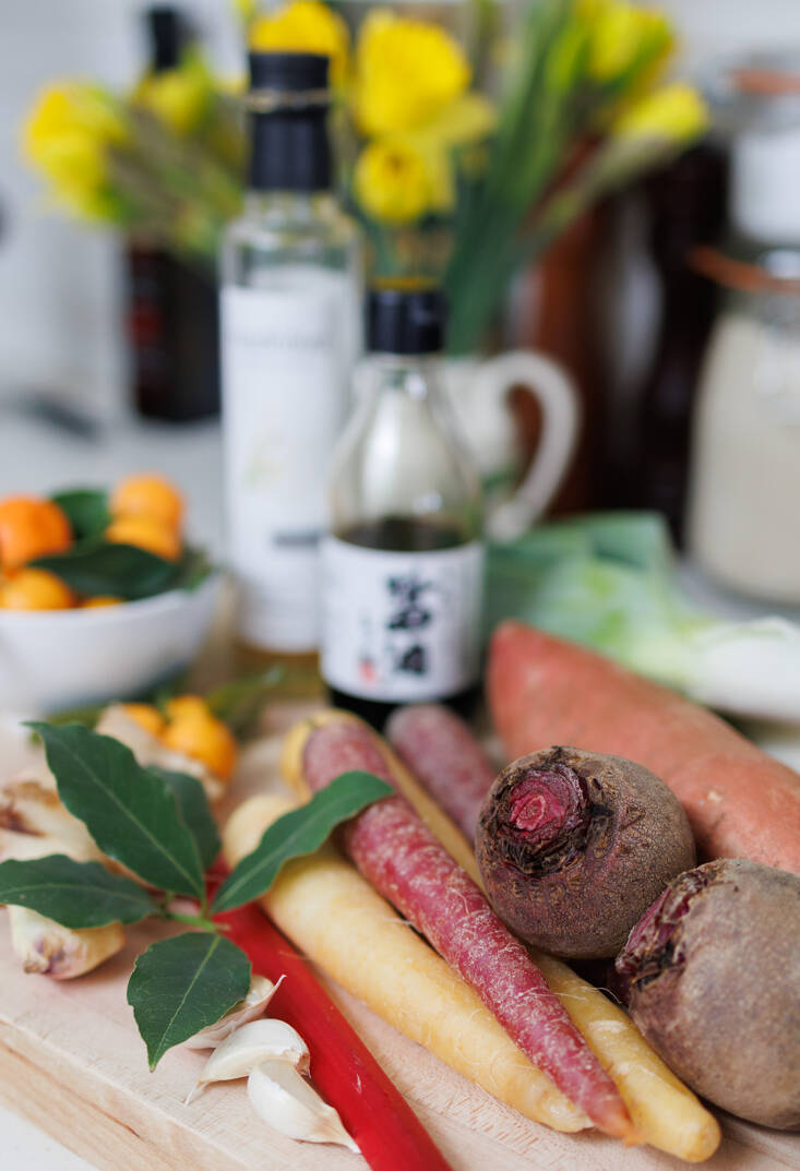Ubiquitous in Filipino cuisine calamansi, also known as calamondin (Citrus x microcarpa), evolved in Maritime Southeast Asia and is usually used unripe, before it turns orange. Traditional Filipino adobo combines soy and vinegar in slow-braised meat-based dishes. In this root vegetable riff, sweetly earthy vegetables and aromatically sour calamansi are a fortifying digression. Fresh bay leaves, from our indoor tree, add a satisfyingly authentic layer of aroma. (The Mediterranean bay leaves in adobo would have been a Spanish colonial introduction.)