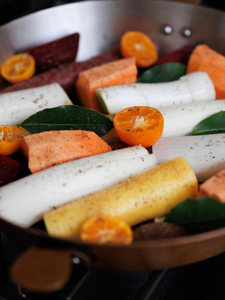 Root vegetables and leeks add natural sweetness to the delicious sour-salty sauce. Vegetable sizes vary widely, so feel free to eyeball quantities and add or subtract vegetable as you wish. If you do not grow calamansi, substitute half of a quartered Meyer lemon and a quartered clementine (both with skin on), their seeds pricked out. Or settle for the clementine and add a big squeeze of regular lemon juice.