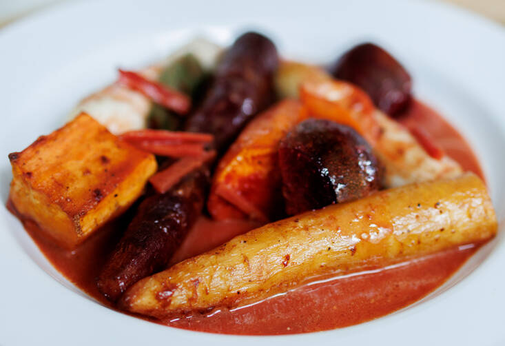 The essence of a Filipino adobo is the savory sauce—salty with soy sauce, sour with vinegar (and calamansi in this case), and svelte with optional coconut milk. So feel free to improvise with the vegetables in it: You could also add waxy potatoes, parsnips, turnips, and even leafy greens like beet greens, kale or chard, as long as those green things go in about 25 minutes before the end of cooking time, stirred in and under the other vegetables. If you love baby spinach, add that five minutes before the end and stir into the sauce.