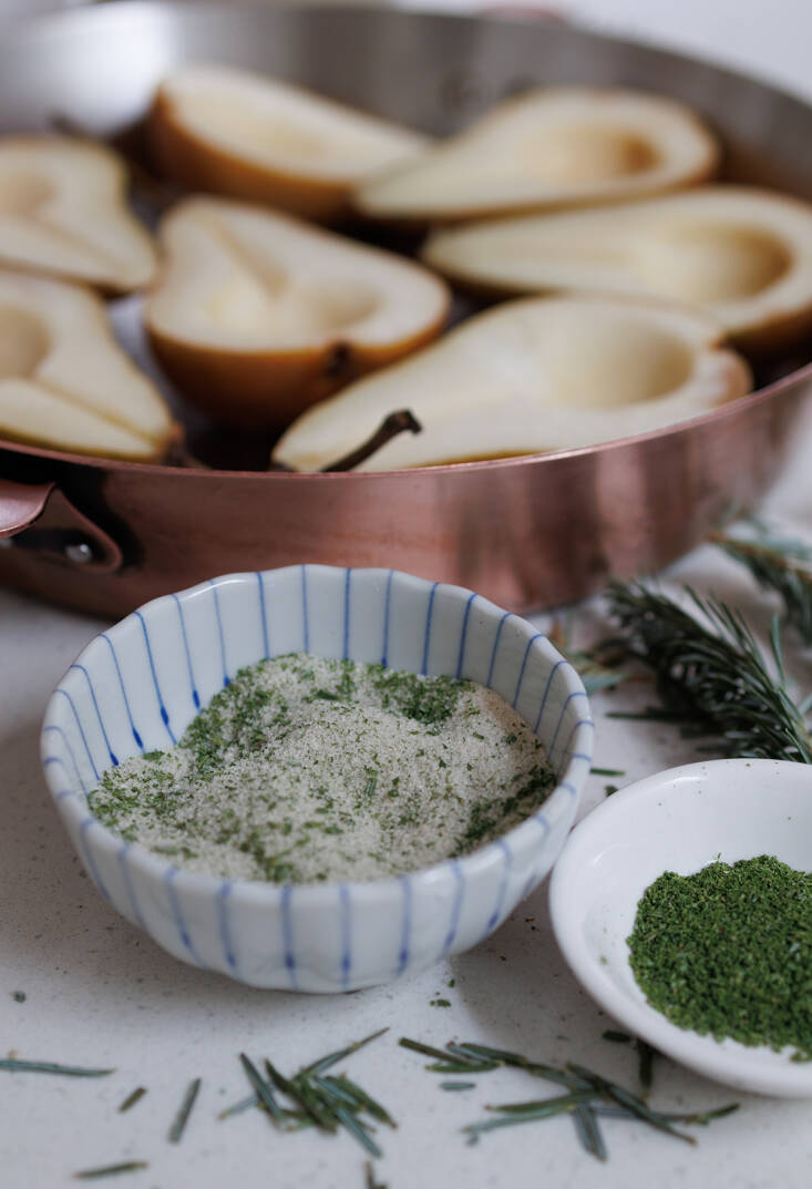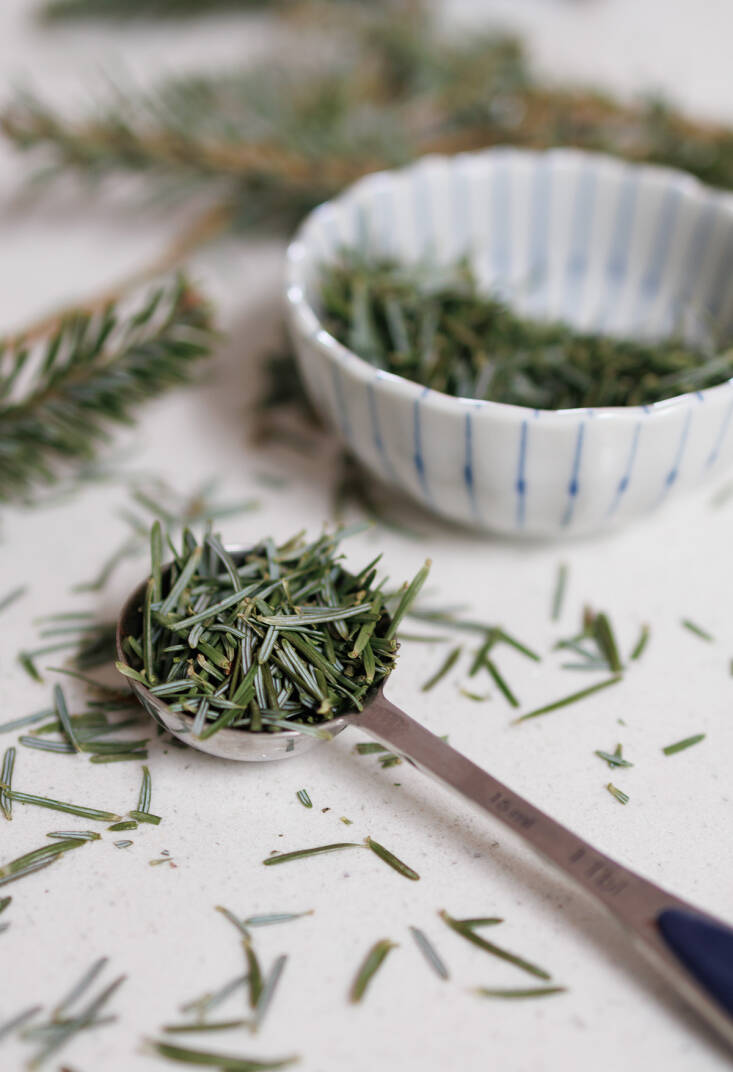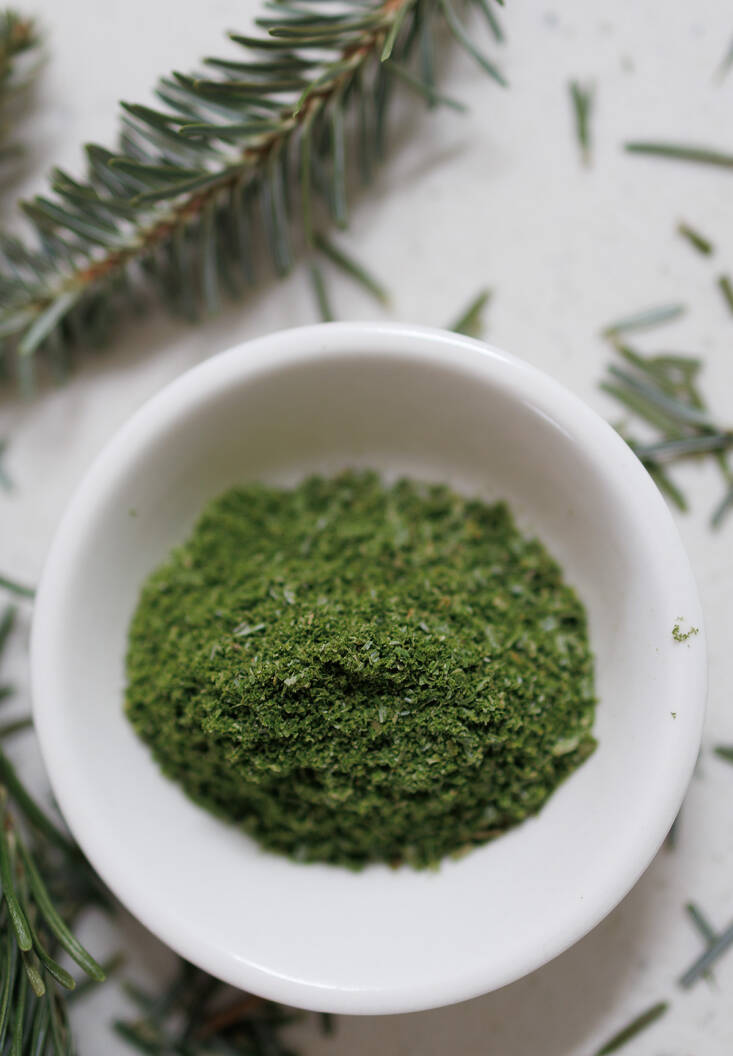 I always save some branches from our organically grown Christmas tree so that I can strip the needles from it to use as an aromatic through the cold months. A jar lives in my spice collection, right next to the juniper. Fir needles are more versatile than you might think: I use a whole twig to infuse savory dishes like braised duck or roasted carrots. Or hot tea, or toddies. But the advantage of turning the needles into a fine powder to scent sugar (or salt, for that matter) is that it becomes entirely edible and spares you a mouthful of, well…needles. Fir sugar flavors cookies and other bakes, and the salt is superb with fatty fish, like salmon.