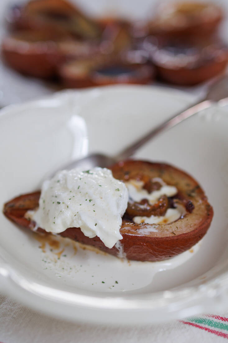 Bake for 45 minutes and then baste the pears with the cooking liquid. Roast another 45 minutes, checking occasionally to make sure that the pan has not dried out completely. A syrupy liquid is what you’re looking for. Add a splash more water if it gets very brown and dry.