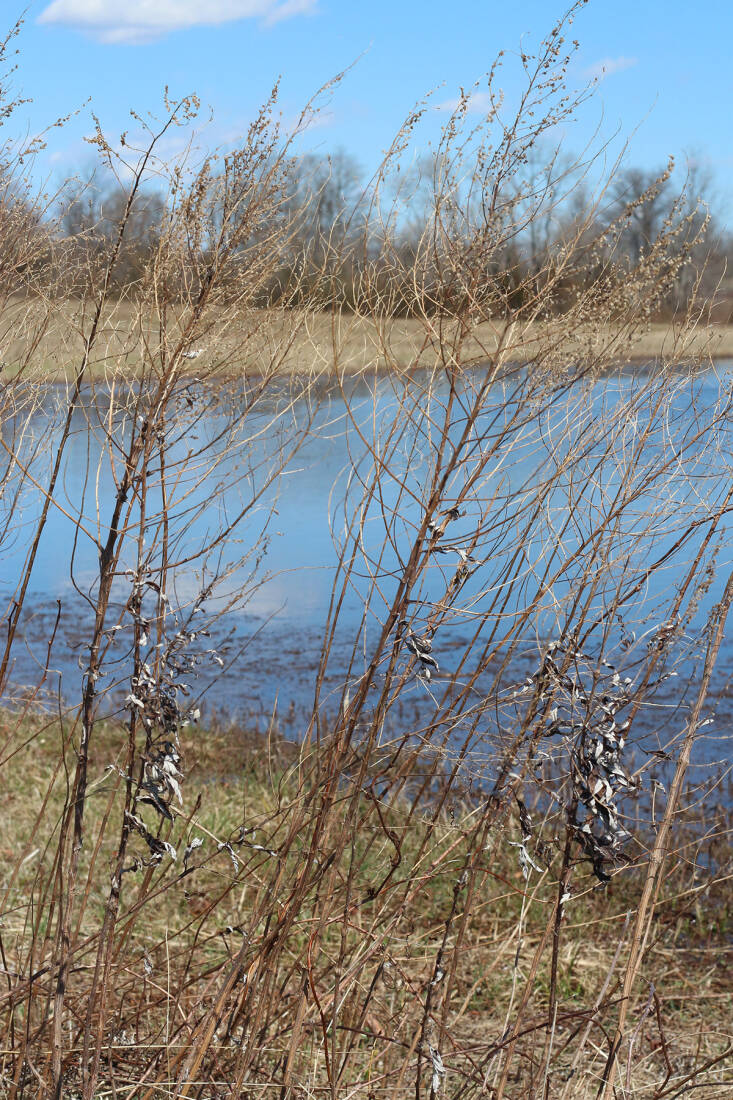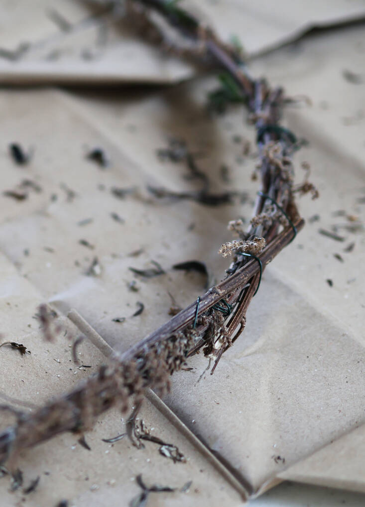 To make a wreath, you need a base or frame to which to attach all your trimmings. Willow is ideal, and red twig dogwood works very well, too. But locally, I gather long mugwort sticks, which are abundant and, yes—again—very invasive. If the mugwort is already dry and brittle, soak it overnight in a bucket before bending the stems easily into a circlet. You need about 15 stems (20-ish inches long) to make a strong base, starting with the thicker sticks and weaving the ends into the next piece to fashion the size you want.