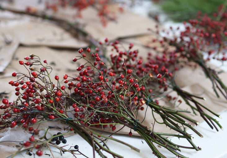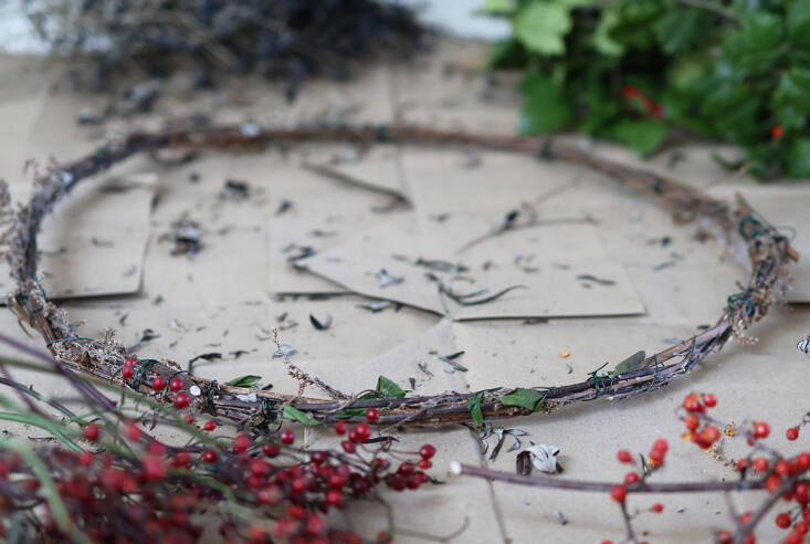 In addition, you will need secateurs for cutting branches, gloves for sharp thorns, and, at home, florists’ wire for easy attachment. (A 22-gauge floral wire is easy to use and very strong.)