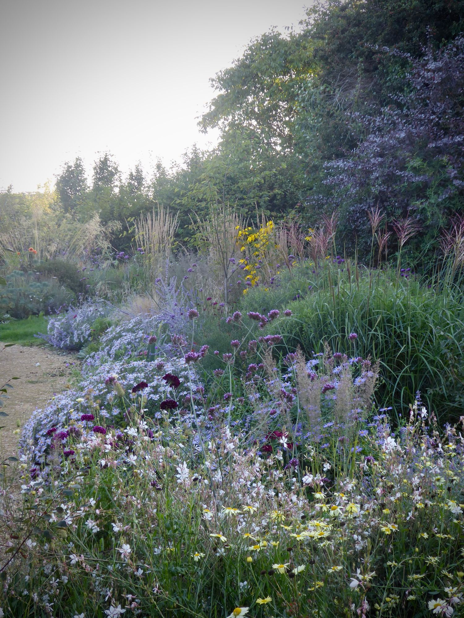 This is the youngest border in my garden, pictured here in its second summer. Pictured in early September the green mounds to the right are Asters that have yet to flower, but they provide a verdant backdrop to the other plants that have an earlier flowering season.