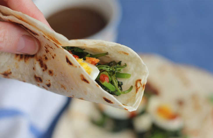 More like a pizza, the dough for this rustic tart is nothing but flour and olive oil and water; instead of being solid, it is crisp and flaky, and very easy. For the topping I used wilted pigweed (or lamb’s quarters) leaves.